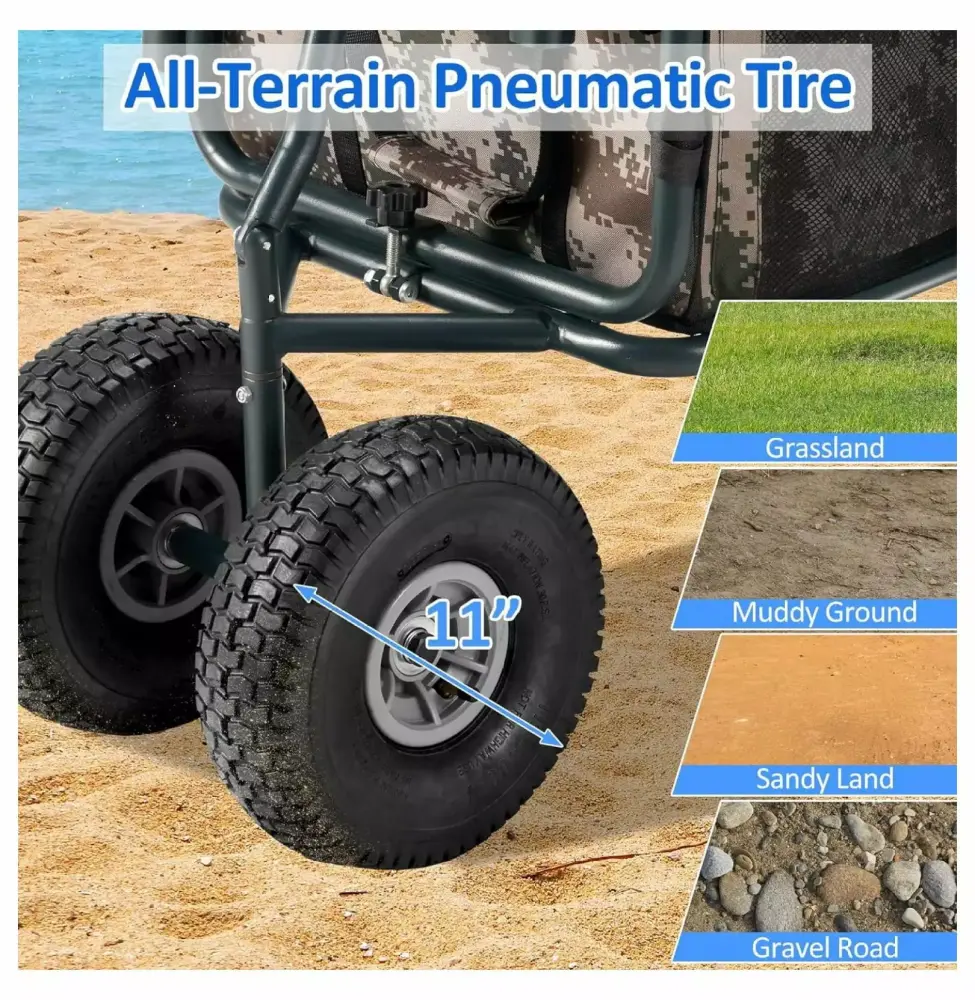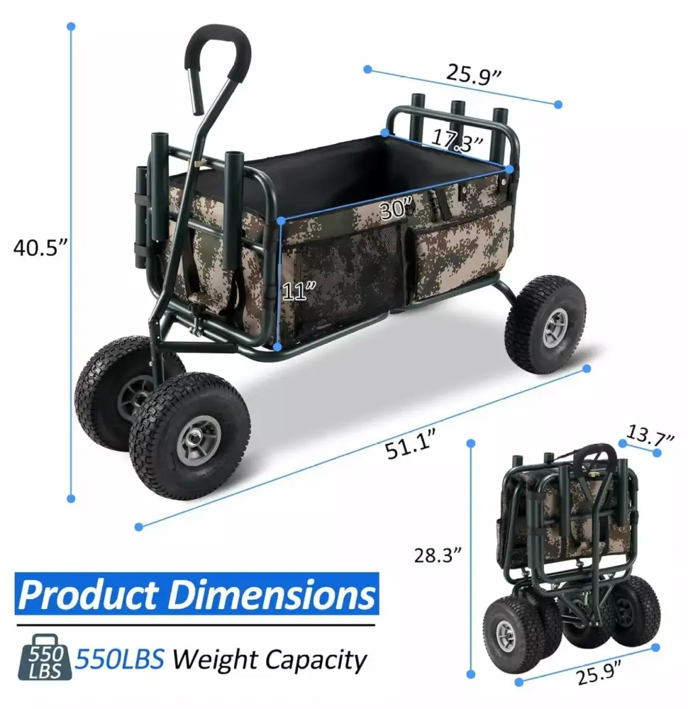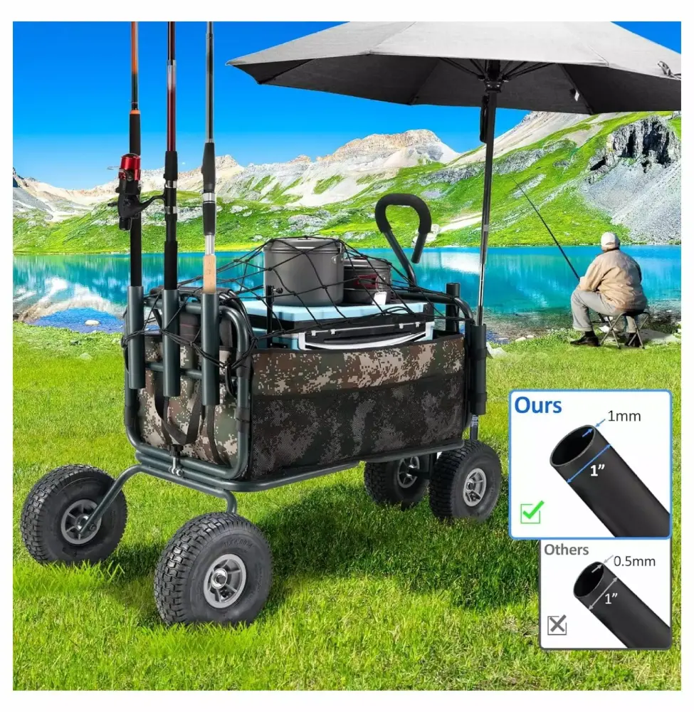 Multifunction Fishing Cart The fishing wagon cart includes 5 Fishing Rod Holders. an Umbrella Holder. Great for fishing. yard work or as a shopping cart. Storage Bags Side pockets with zippers and 4 breathable mesh pockets can meet most storage needs. All Pneumatic Tires Four 11” large diameter allterrain universal pneumatic wheels can easily carry cargo on a variety of . Sturdy and Durable Sturdy steel tube frame supports over 500 lbs of gear for stable performance.