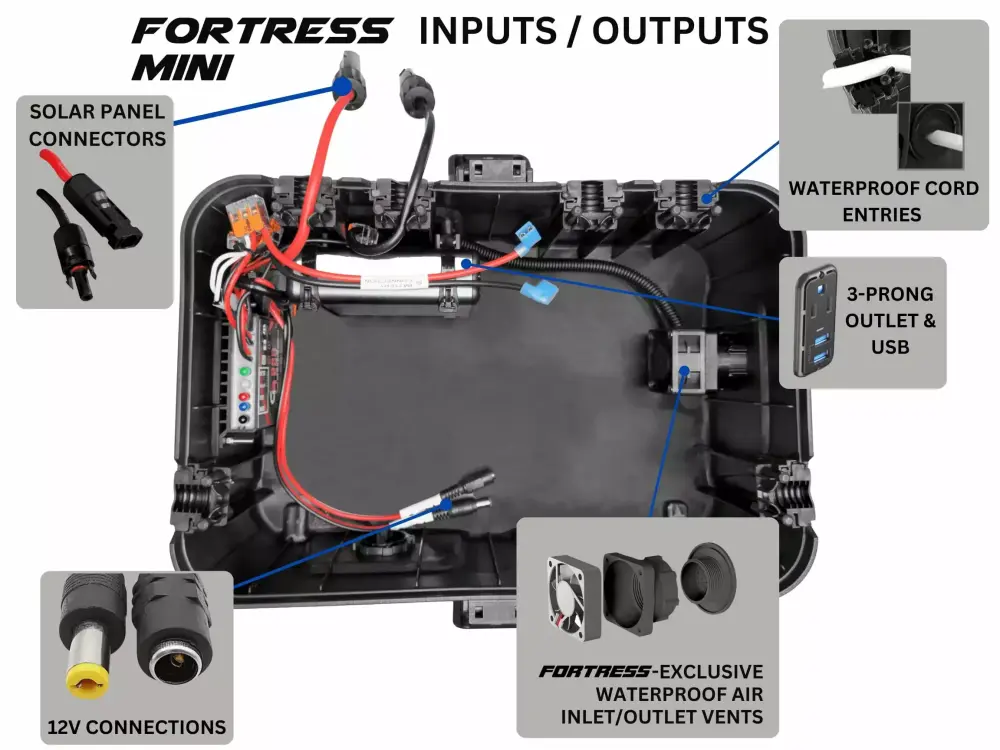 Reliability means Fortress mini is designed to live outside 24/7 and has smart temperature controls to cool the internal components to prevent overheating. as well as a built-in battery heater to prevent freezing. The enclosure is waterproof and includes waterproof cord entry/exits on all sides.