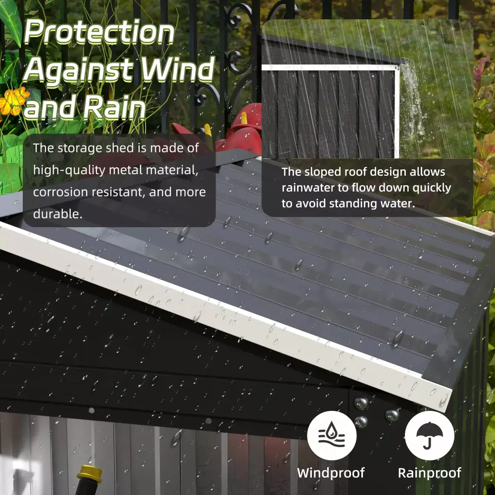 - Sturdy and Stable Metal outdoor storage shed is a steel frame structure with an electro-galvanized steel process and paint treatment. which is suitable for all kinds of climates. no need to worry about metal rust. the metal storage shed won’t be deformed by sunlight. and it has excellent moisture-proof performance