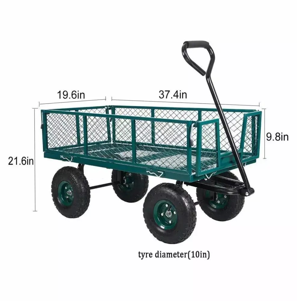 Specification Color:green weight:42LbsMaterial of frame:steel Material of wheel: RubberWeight Capacity:550lbProduct dimension:37.4 x 19.6 x 21.6 Wheel size diameter:10inFeature: Steel wagon for transporting up to lb. of supplies. equipment. and materials Steel mesh crate with powder-coated finish for durability and corrosion resistance Crate sides fold down or remove for flatbed use with oversized loads Four 10" pneumatic rubber tires for use outdoors and on most flooring typesDiscription: This green collapsible Utility Wagon is certainly your good choice Durable steel frame can ensure it can be used time and time.4 oversized large pneumatic rubber wheels make this wagon more stable. To facilitate loading and unloading of heavy items from the wagon. the sides of the crate fold down.To move heavier objects. by removing the foldable sides with the quick release hinges.Great for gardens. warehouses. construction sites and much more!.