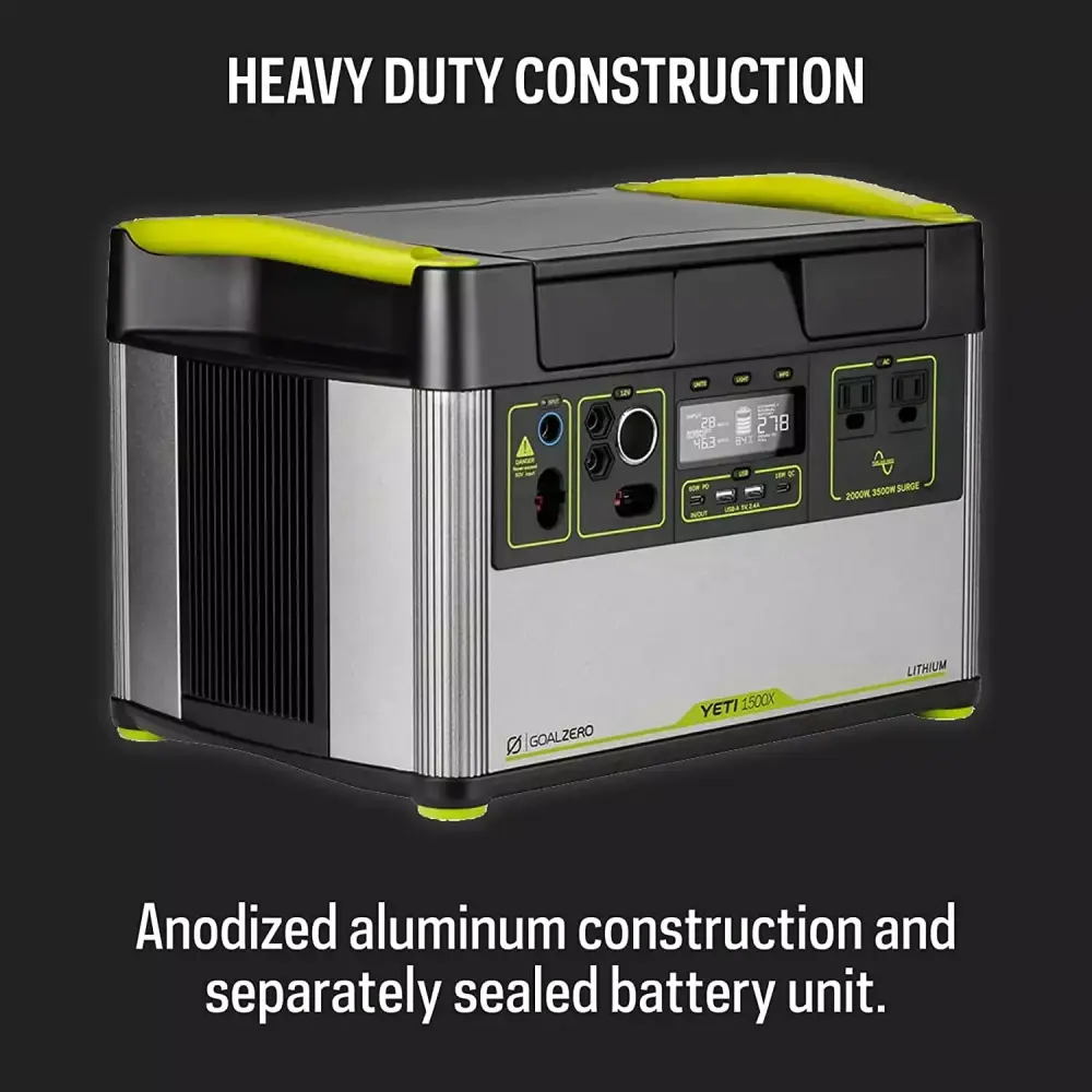 - DURABLE AND SAFE: Professional grade construction with a heavy duty anodized aluminum enclosure and internal separately sealed battery unit provides years of use at home or off-grid. Goal Zero uses only the highest quality Tier 1 Lithium battery cells. which are protected by an advanced multi-sensor battery management system. Our best-in-class US-based customer service is there whenever you need us. and our 2-year warranty backs the Yeti 1500X for additional peace of mind.