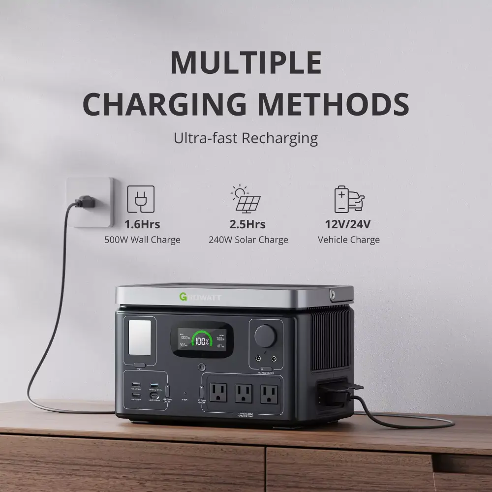 This solar generator can be recharged in 3 ways. including wall charge (1.6h). solar charge (2.5h). and vehicle charge. - Powerful Watt Feature