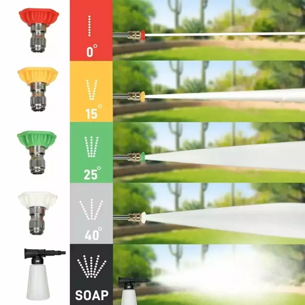 4 Nozzles and Soap Bottle: Power washer comes with 4 interchangeable nozzles (0 . 15 . 25 . 40 and soap). 0o – areas that are high and hard to reach; clean crevices in sidewalks or driveways; 15o- use on concrete. brick. and other hard surfaces with stubborn stains; 25o- use on painted surfaces. wood siding. fences. and lawn mowers;40o- use on windows and screens; soap- use to spray soaps and detergents. Freely select the high-pressure nozzle best suited to your task.