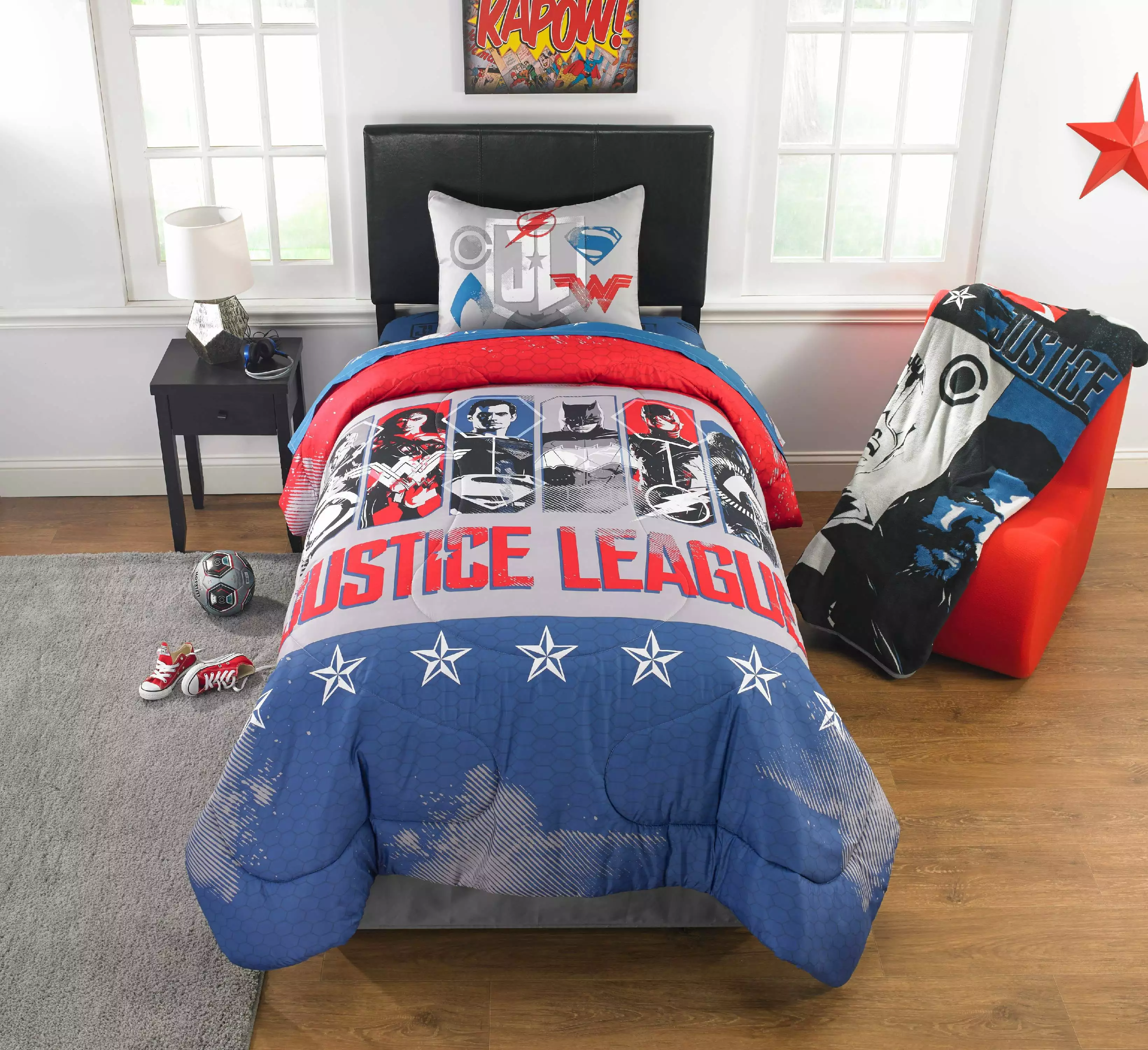 Your child will be warm and cozy at bedtime when they snuggle up with this super soft Justice League "Icons of Justice" twin blanket. Blanket features Batman. Wonder Woman and the team they have assembled to confront the evil Steppenwolf and his arm. It is made to fit a twin size bed and is 100 percent polyester which makes washing and drying a breeze for busy Moms. Perfect to wrap up in for nap time or while sitting on the couch watching their favorite movie or TV show. Pair the blanket with reversible twin/full Comforter and sheets to complete the ensemble. Makes a great gift!Justice League Team Assembled Throw