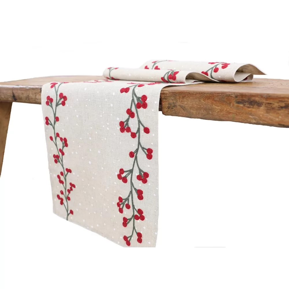 Christmas holly berry branches crewel embroidered on linen blend natural fabric with full snow dots printed. This table linens collection creates a warm and festive setting for your holiday meals and gatherings. Make this appealing for any Christmas holiday setting. As your definitive home decor destination, we feels that every day should be lived fashionably. Our distinctive designs, rich details, and tempting accessories are sure to endlessly fulfill your homes finicky fashion sense. Whether you are keeping up with the ever changing colors of the holidays and seasons, looking for a stunning piece to tie your existing interior decor together while staying in tune with your individual style, or simply in need of an easy care focal point for an upcoming party or event, Xia Home Fashions and Manor Luxe has stylish creations that will complete your look and win complements at your next gathering.