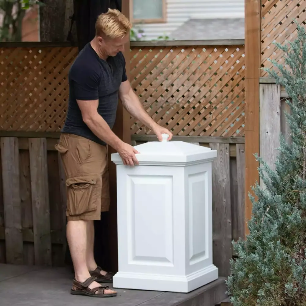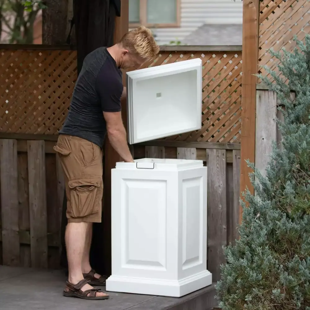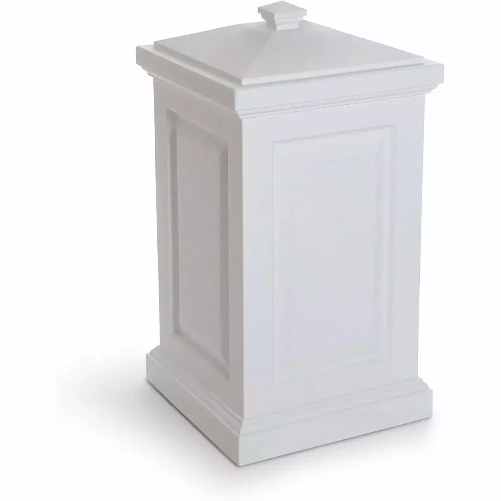 The Berkshire is a multi-purpose storage bin that offers the perfect blend of style and functionality. This bin is ideal as a backyard waste bin and includes hooks (x2) to hang your waste bags. It can also be used to hide children’s toys. gardening tools. birdseed. or bags of salt for the winter months. This Polyethylene storage bin is weatherproof and has an ultra-tough construction. It is available in Black and White.Features : Our products are made with 100% high-grade polyethylene resin.The resin used in these bins have built-in UV inhibitors that ensure it does not fade easily.The Berkshire Storage Bin comes with a removable lid with a snap-fit design and 2 waste bag hooks.Mayne offers a 15-year residential warranty or a 5-year commercial warranty on this storage bin.Our products are proudly designed in Canada and .Specifications : Color/Finish : WhiteCommercial/Residential : BothIncluded : Instructions. removable lid & base. 2 waste bag hooksMaterial : Polyethylene Resin PlasticProduct Dimensions : 38"H x 20"W x 20"DProduct Weight : 16.5 lbsWarranty : (Residential) 15 years; (Commercial) 5 years. 1 year limited warranty on hooks