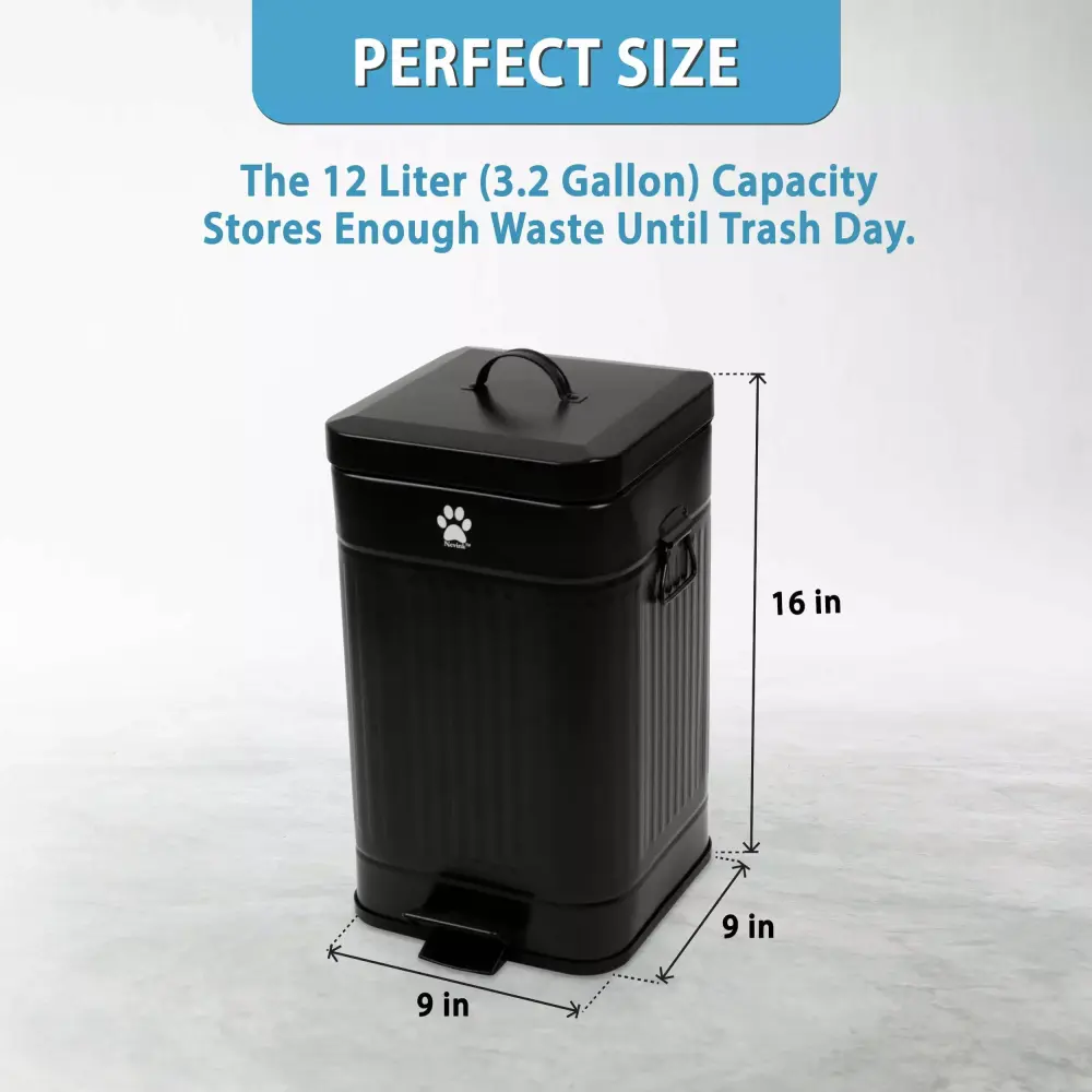 - 12-Liter Capacity Comfortably store enough dog waste until trash day. 5-Liter waste bins are too small and must be dumped frequently.