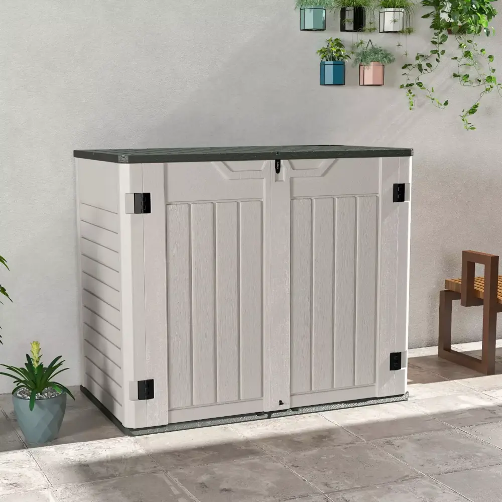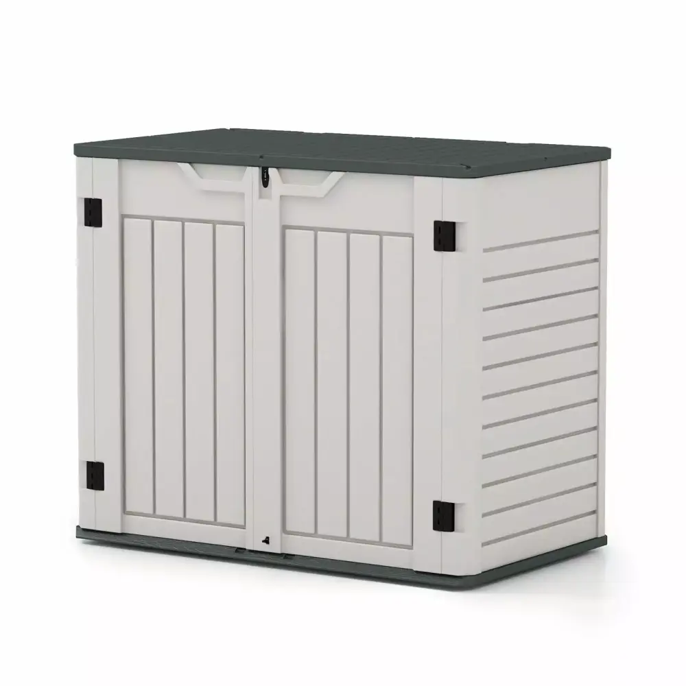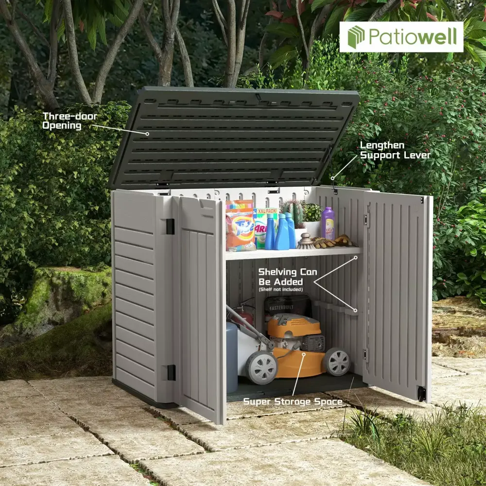 Do you always have tools scattered around your yard Do you want an outdoor storage shed that will withstand the elements and last This Patiowell storage shed is not only great for storing bikes. weed whackers. or gardening tools. but also for storing two 32-gallon trash cans. 26 cubic feet of capacity and a sturdy built-in floor. and even built-in support (shelf not included) help you make the most of the space inside. perfect for storing large amounts of items. The three-door design gives you the flexibility to open and close the two doors and upper cover independently. in addition to the lockable locking system (lock not included). and comes with an additional Latch design for added security. The storage shed can be assembled with minimal tools and is very easy to clean and maintain.