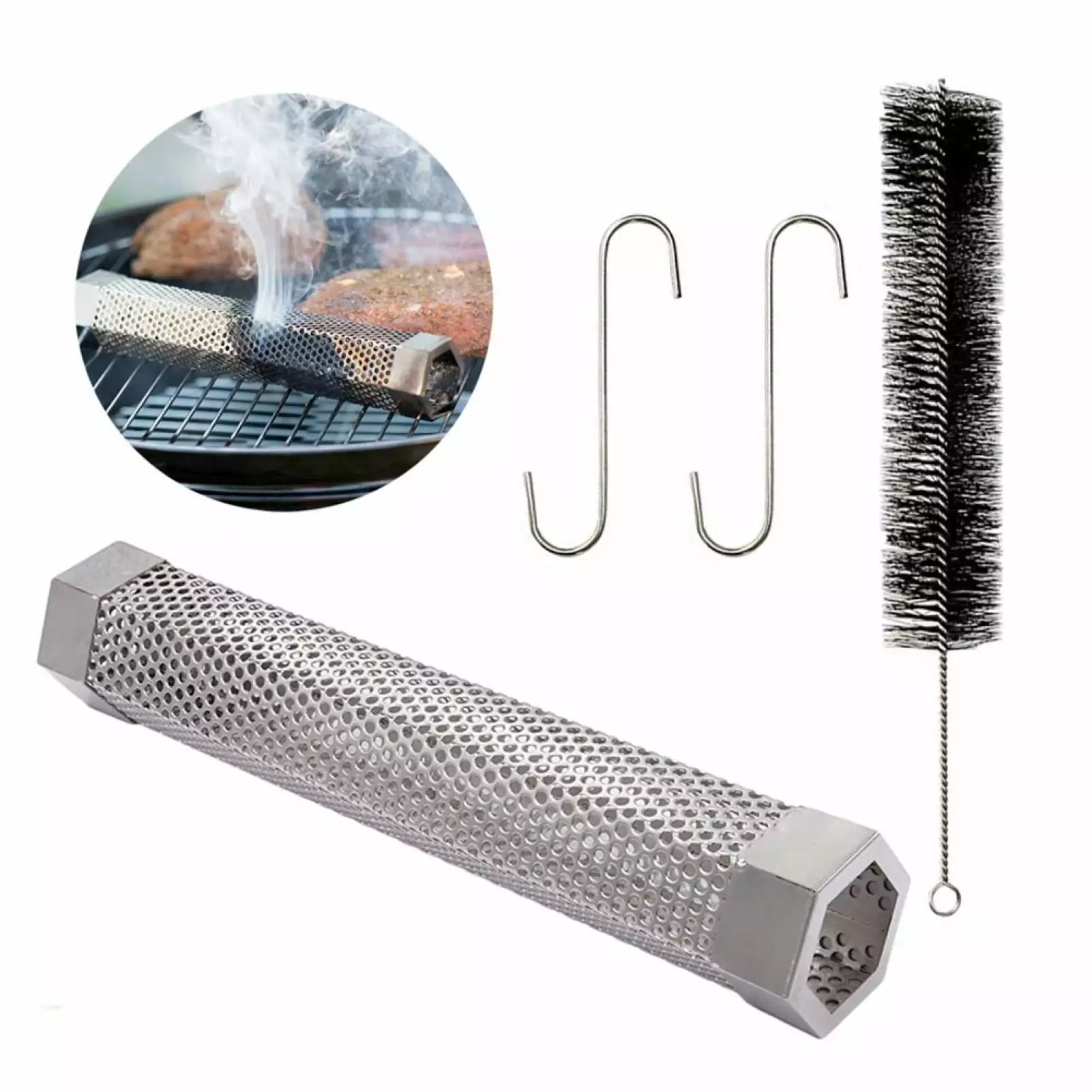 1 x BBQ Smoker 2 x Cleaning Hook 1 x Cleaning Brush 1 The pellet smoker tube has massive density diffusion holes on its body.