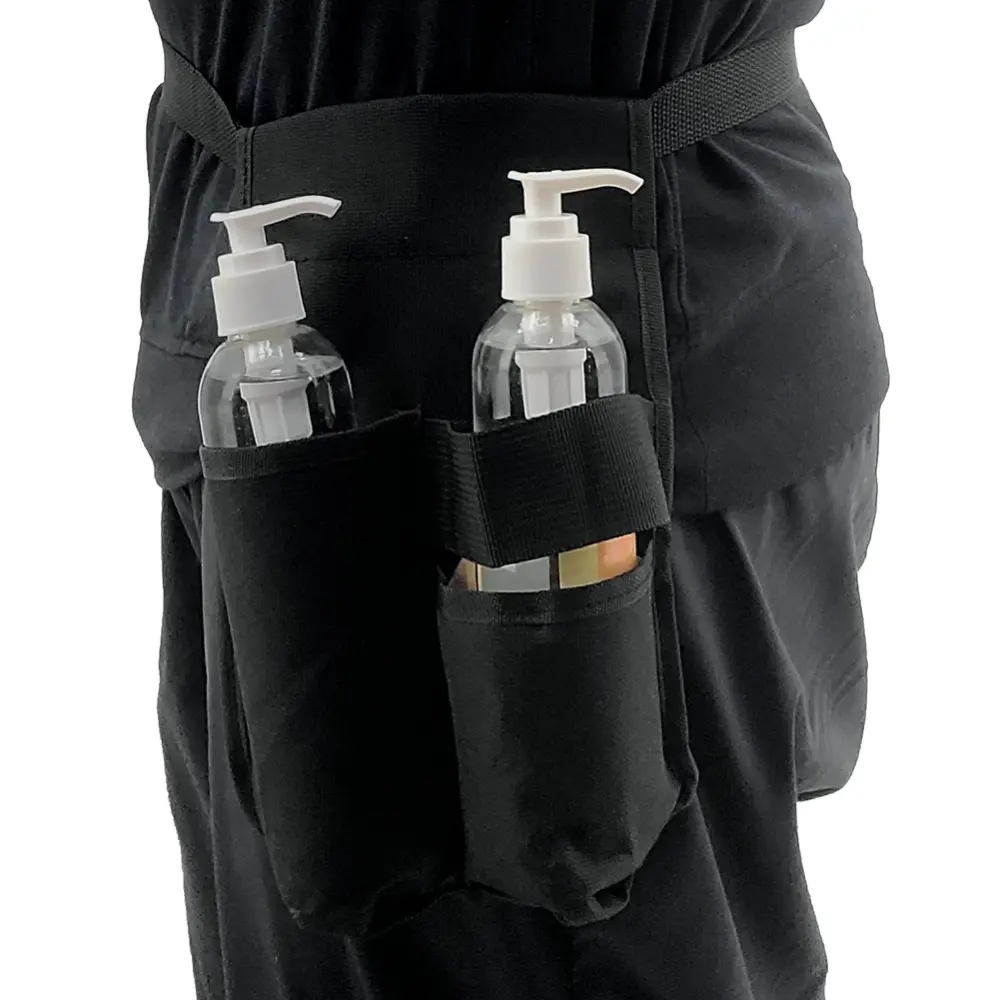 This convenient holster holds your massage oil bottles and keeps them within hands reach at all times. With an adjustable strap. you can hang it on your shoulder or wrap it around your waist. The double pockets hold 2 individual bottles (not included)..