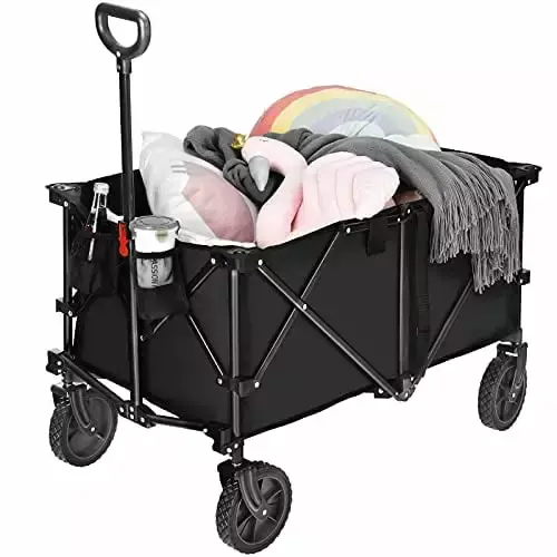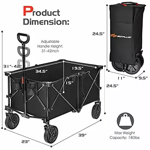 - Foldable Design for Space-saving This folding utility wagon can be folded in seconds through simple steps and can be packed into the matching storage bag. You can store it in the corner to save space if not in use or put it in the trunk when going out.