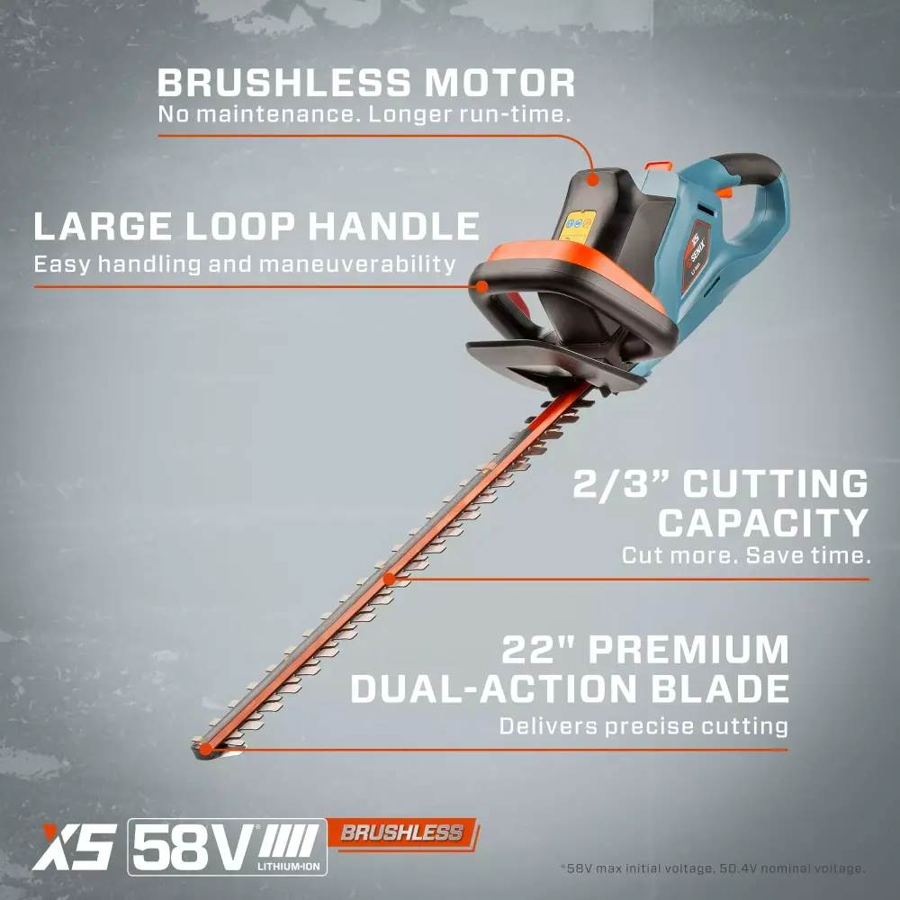 The SENIX HTX5-M X5 cordless 58V Max* 22-inch hedge trimmer features a high-performance brushless motor that delivers smooth. consistent power for trimming. shaping. and sculpting trees. shrubs. and hedges. The precision laser cut dual-action blades cut branches up to 2/3-inch. The integrated front handle safety switch prevents unwanted start-ups. Blade cover included. For use with SENIX B25X5 58V Max* 2.5 Ah battery and SENIX CHX5 2 Amp charger. All SENIX 58 Volt Max* cordless products and all SENIX lithium-ion batteries and chargers are backed by our 3-year limited warranty for your peace of mind. *58 Volt Max* battery. maximum initial battery voltage (measured without a workload) is 58 volts. The nominal voltage is 50.4.