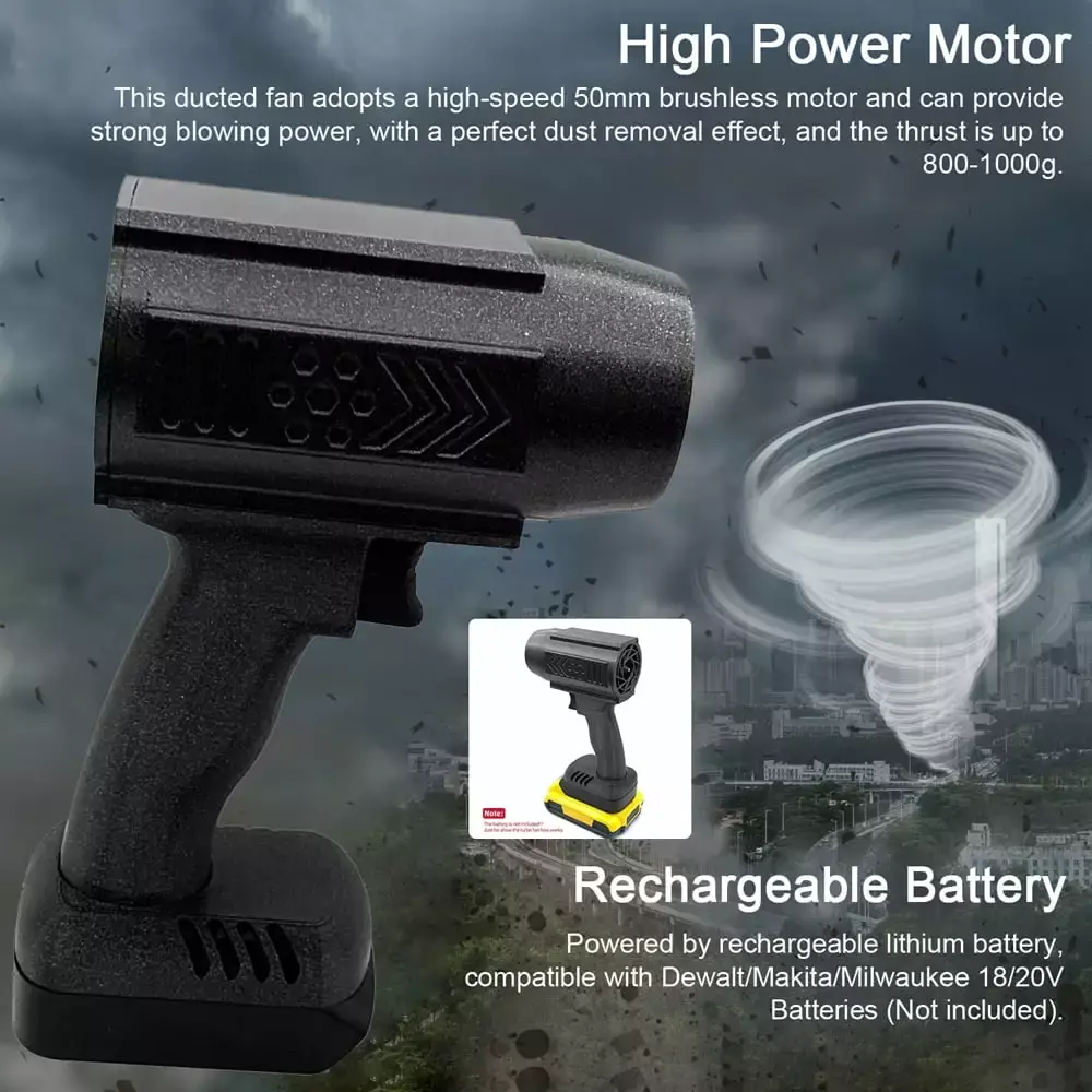 Handheld Ducted Turbofan 50mm Brushless Motor Jet Fan 1000g Thrust Car Washer High Power Dust Blower Keyboard Cleaning Tool Compatible with Dewalt 18V 20V Batteries: Cordless handheld fan is small and exquisite. compact and lightweight. and can be easily carried. This fan is simple in design. reasonable in structure. and powerful in performance. with better utility and wider application scenarios. and customized for tight spaces.It is a versatile cleaning tool for home. car. and office. suitable for carbon fire blowing. industrial dust blowing. soot blowing. keyboard cleaning. car and motorcycle cleaning. car center console cleaning. car crevice cleaning. foot mat crumb cleaning. picnic garbage cleaning. etc.Press type speed regulation. and you can adjust it according to the use requirement. Use as desired. easy and convenient operation. greatly improves your cleaning efficiency. Ergonomic handle design. comfortable to hold.Powered by rechargeable lithium battery. compatible with /Makita/Milwaukee 18/20V Batteries (Optional. Not included).The entire casing is crafted through 3D printing using an exceptionally robust PETG & carbon fiber blend. wear resistance and with long durability. Built-in large-sized fan blades. which are machined by high-precise for high durability and efficiency.This ducted fan adopts a high-speed 50mm brushless motor and can provide strong blowing power. with a perfect dust removal effect. and the thrust is to 800-1000g.