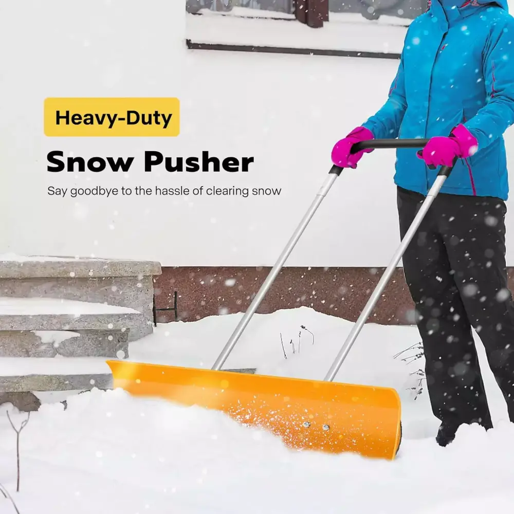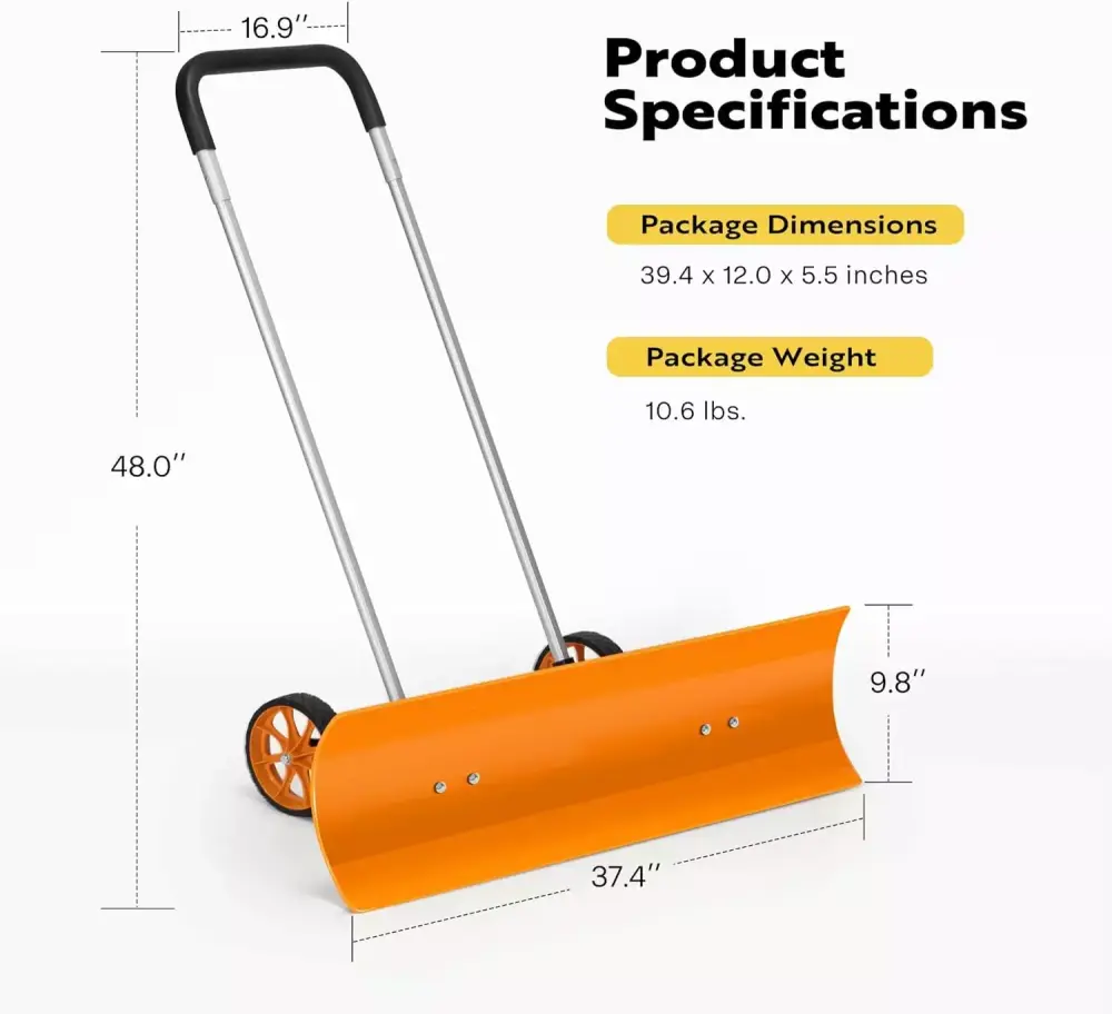 - EFFECTIVE PERFORMANCE – It comes with a 37.4-inch blade. the snow plow shovel can efficiently clear away snow up to 10 deep in a single pass and thin ice. making it ideal for residential or facility maintenance use; Equipped with an angled blade. this snow pusher can work in bi-directions. perfect for completing tasks such as shoveling. plowing. pushing. and scraping snow with ease; It is designed for pushing windrows. allowing for a quicker and more efficient removal process