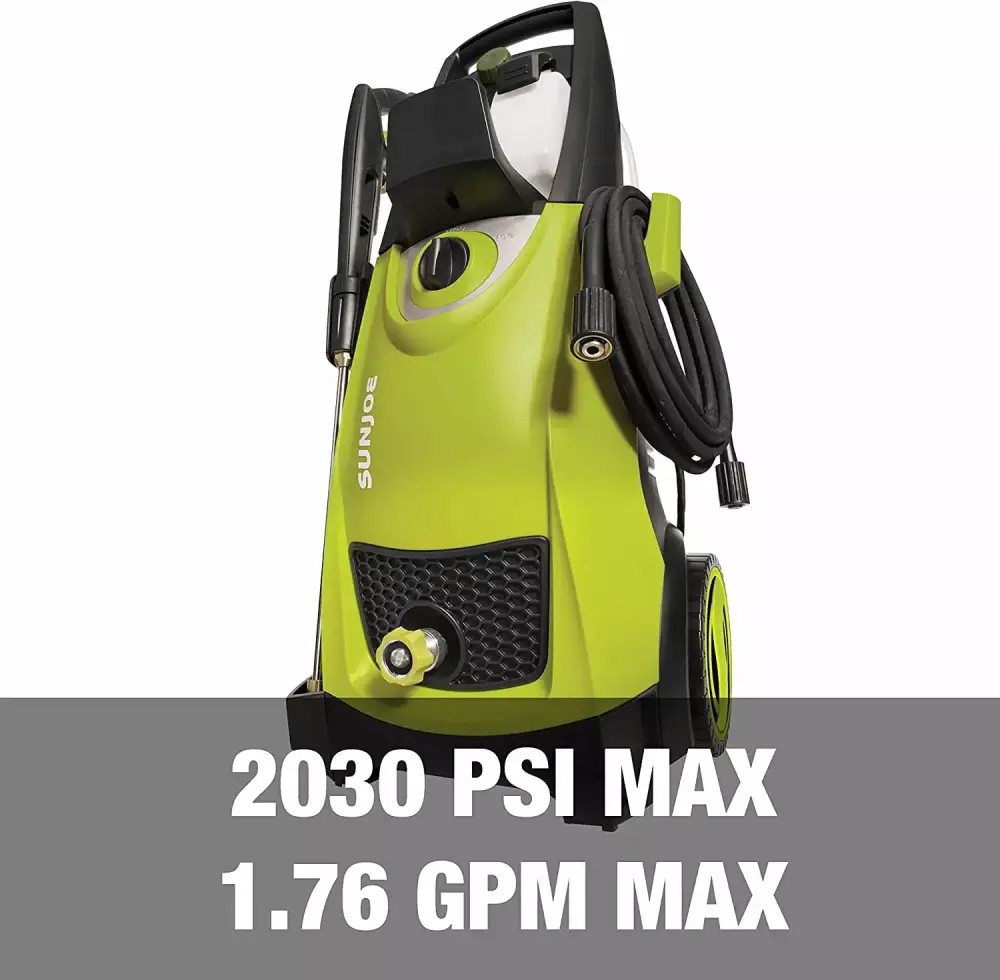 THIS ELECTRIC PRESSURE WASHER GETS YOUR DIRTY WORK DONE. The Sun Joe SPX3000 pressure washer delivers it all to tackle a variety of cleaning tasks: homes. buildings. RV’s. cars. trucks. boats. decks. driveways. patios. lawn equipment. and more. OUR BEST-SELLING PRESSURE WASHER. THE SPX3000 COMBINES POWER. PERFORMANCE. AND VERSATILITY. This pressure washer packs a powerful punch with its 1800-Watt/14.5-amp motor. The Sun Joe SPX3000 electric pressure washer generates up to 2030 PSI of water pressure (at initial discharge per CSA internal pressure testing) and 1.76 GPM (with nozzle open at minimum pressure) of water flow. Remove tar and grease from concrete. heavy mildew stains. oil stains. rust from steel. caked mud on equipment. and other stubborn gunk and grime. THIS ELECTRIC PRESSURE WASHER CONSISTENTLY IMPRESSES CUSTOMERS WITH POWER AND PERFORMANCE. Equipped with a dual detergent tank system. the Sun Joe SPX3000 pressure washer carries and stores two different types of detergent simultaneously in its two 0.9 L onboard. removable detergent tanks. Conveniently switch between different detergents with its detergent selection dial and blast away all sorts of grime. This pressure washer features a 34-inch extension spray wand to access hard-to-reach areas. such as 2-story buildings and the undersides of automotive vehicles and lawn equipment. Plus. its rear wheels provide easy portability around your yard. THIS VERSATILE PRESSURE WASHER IS YOUR ULTIMATE DIRT FIGHTER. This pressure washer lets you tailor the pressure output of the spray to your cleaning need with Sun Joe’s five Quick-Connect spray nozzles (0o. 15o. 25o. 40o and soap). Interchange nozzles to quickly go from a high-pressure 0 pencil point jet to a low-pressure 40 fan spray or apply detergent to the cleaning surface with the soap nozzle for additional cleaning power. Other features on the SPX3000 electric pressure washer include a 20-foot high pressure hose. 35-foot power cord. garden hose adapter. and a TSS (Total Stop System) trigger that automatically shuts off the pump when the trigger is not engaged to save energy and prolong pump life. The SPX3000 pressure washer comes with a full two-year warranty and is CSA listed.
