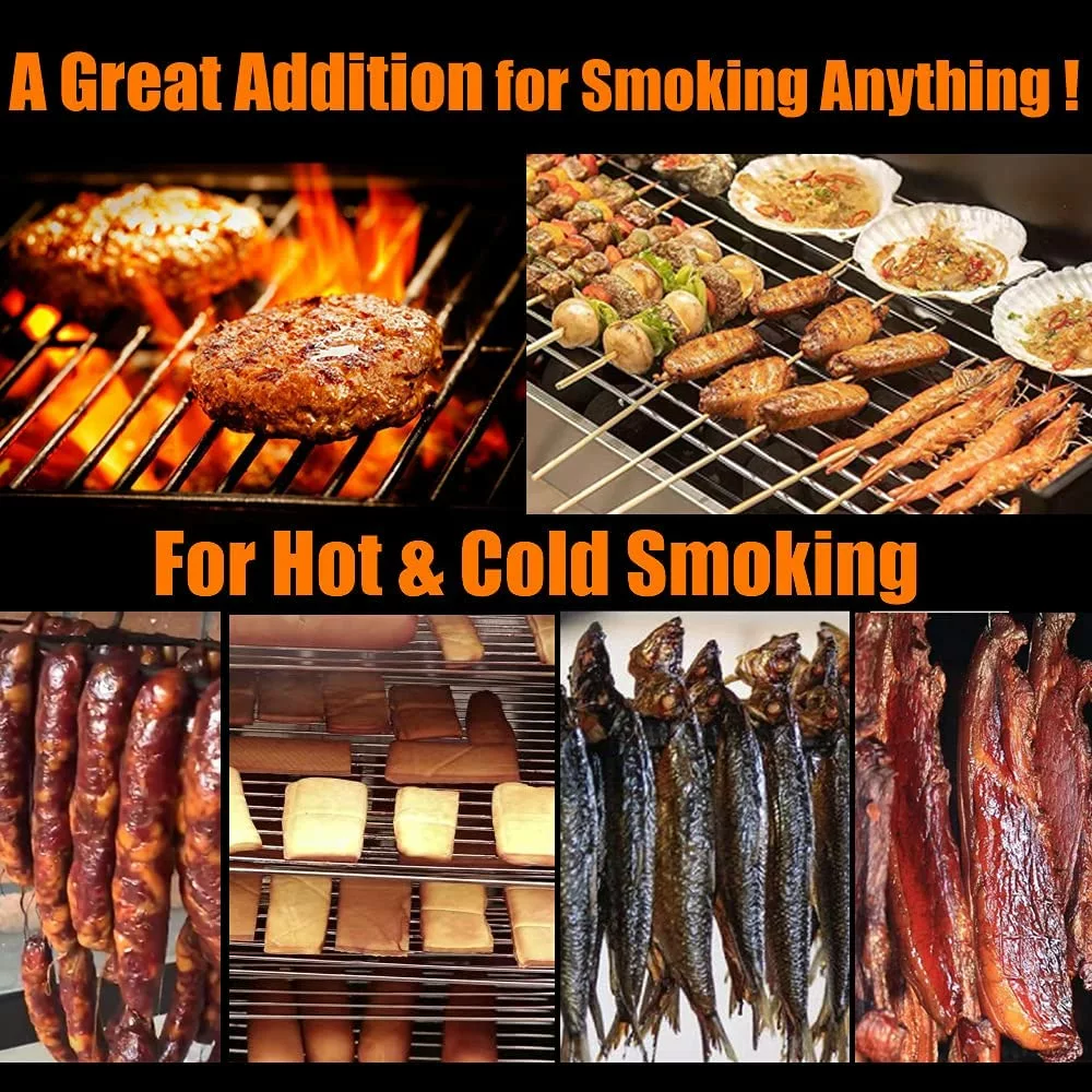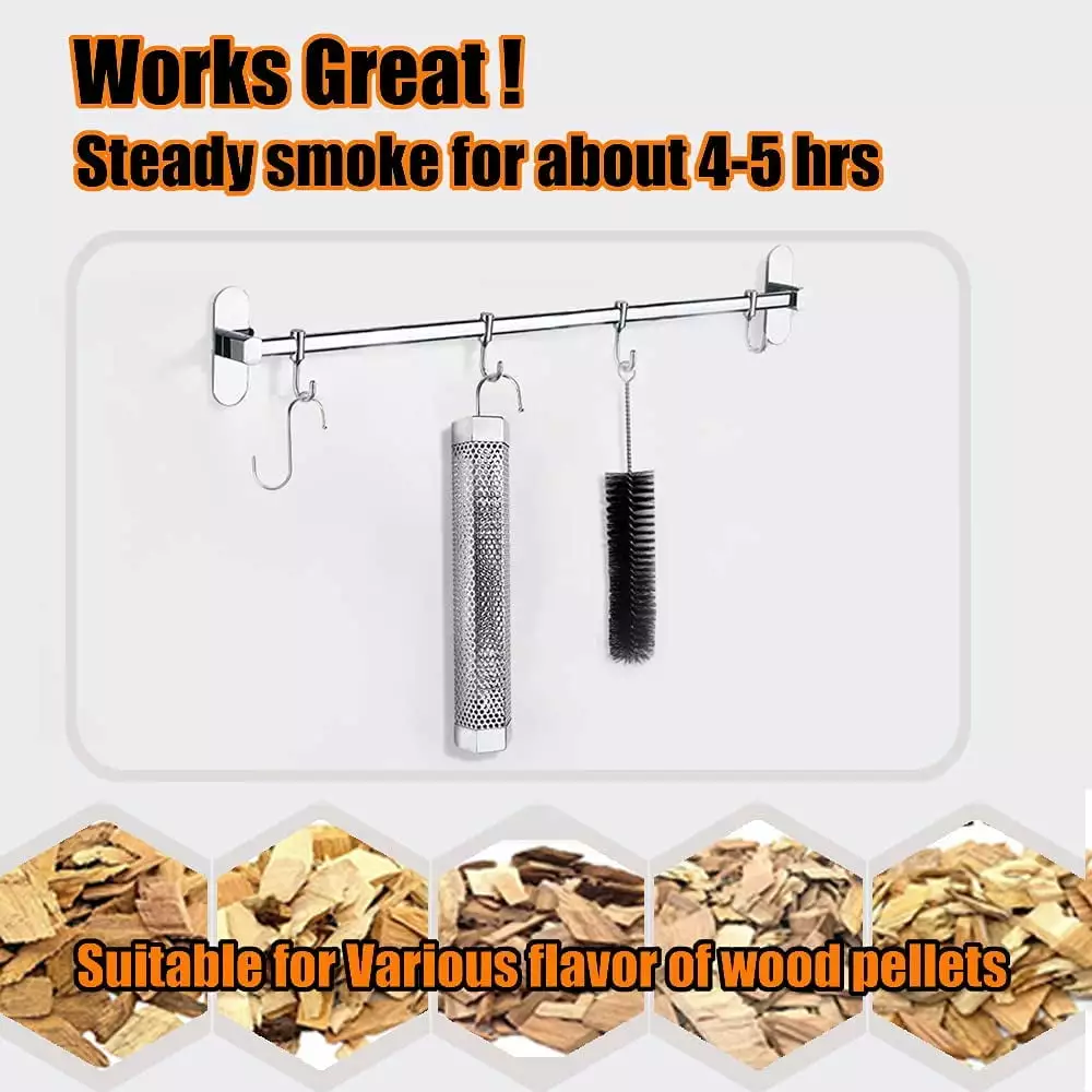 2.This smoke tube can be used with various wood pellets such as cherry. hickory. mesquite. for apple. pecan to add different tastes. The tube smoker works with wood chips as well. You can mix these or stack them in the tube. This smoke tube is perfect for hot and cold smoking. adding wonderful smoking fto many types of food: meats. cheeses. veggies. nuts. bacon. chicken. salt. burgers. steaks. pork. hot dogs. sausages. fruit. corn. and more!