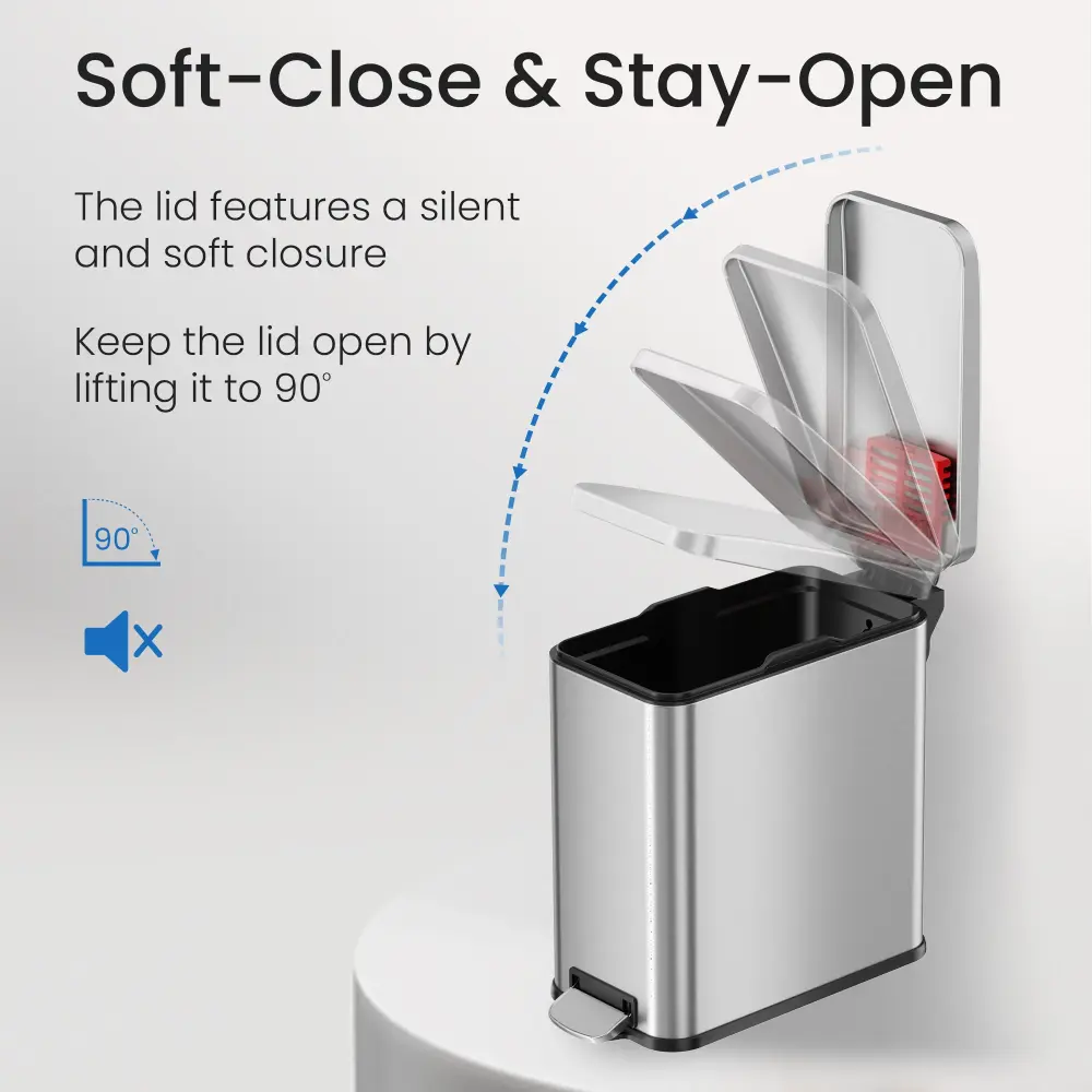 Upgrade your bathroom or workspace with the 3 Gallon / 11.4 Liter SoftStep Stainless Steel Slim Step Pedal Bathroom Trash Can — the ideal compact waste solution for small spaces. Designed for both style and function, this sleek trash can boasts a slim, space-saving profile, smooth pedal operation, and a soft-close lid for quiet, hands-free convenience. The included AbsorbX® organic carbon odor filter keeps your area fresh and odor-free, while the fingerprint-proof stainless steel finish complements any modern décor.