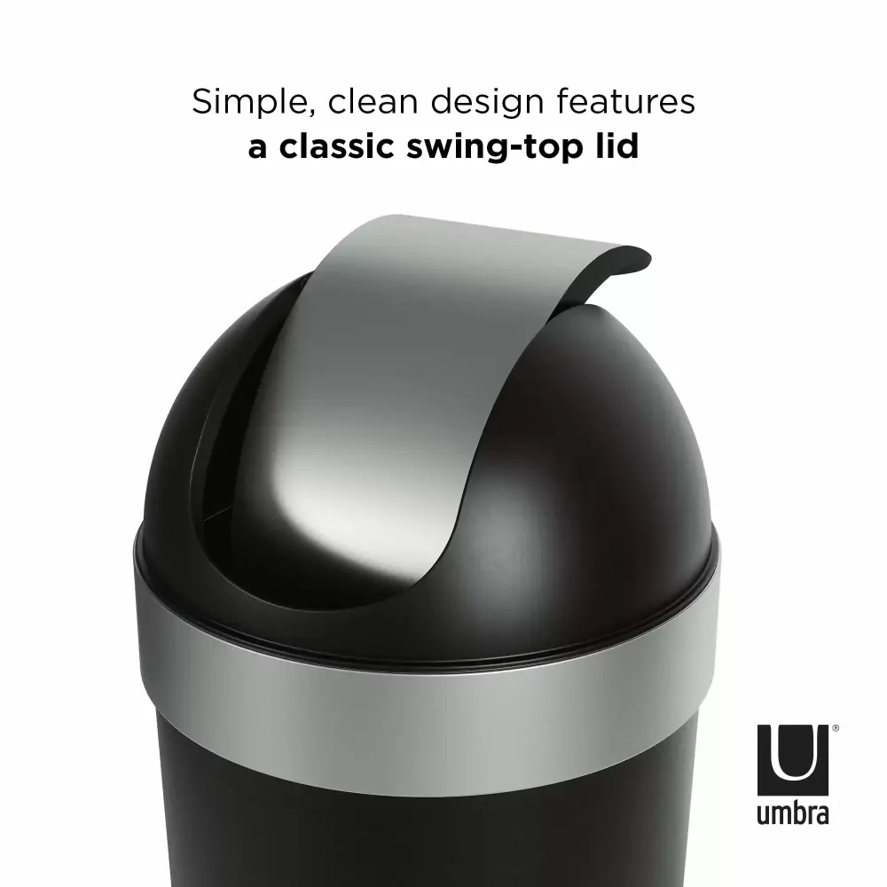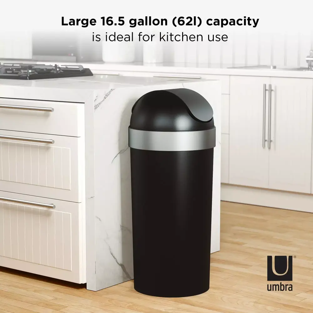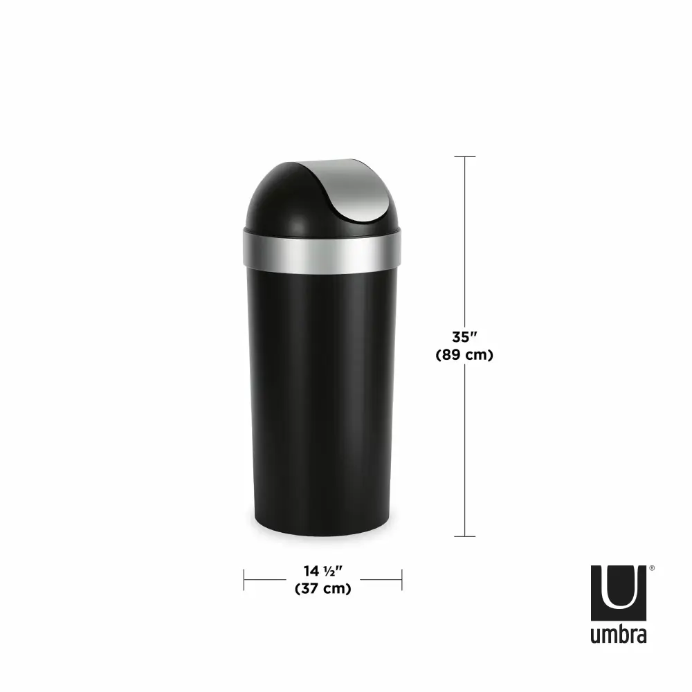Style meets function with this large. easy-to-use garbage can. With sleek brushed metallic accents. a hassle-free molded swing-top lid. and an integrated neck ring. Venti keeps your waste out of sight. Venti Trash Can is sturdy. stable. and constructed of durable black polypropylene. which can be quickly wiped down with a damp cloth. Venti Trash Can is 35 inches (89 cm) tall by 14.6 inches (37 cm) in diameter. with a 16-gallon (62L) capacity. It works with 30-gallon garbage bags. including draw-sting and flap-tie bags. Venti is large enough in size so the bag doesn’t require constant changing but compact enough to fit in almost any space in your home.