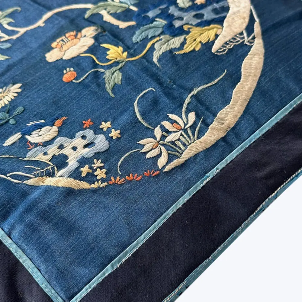 Add celestial nostalgia to your space with the Vintage Silk Embroidery Pillow, Moon Garden by Threads Smooth Goods. Featuring a vintage faade of embroidered florals on beautiful blue silk, this elegant pillow brings a dreamlike feel to eclectic spaces. Backed in plush cotton velvet. Please note, due to the pillowÕs vintage condition, some imperfections may be found.