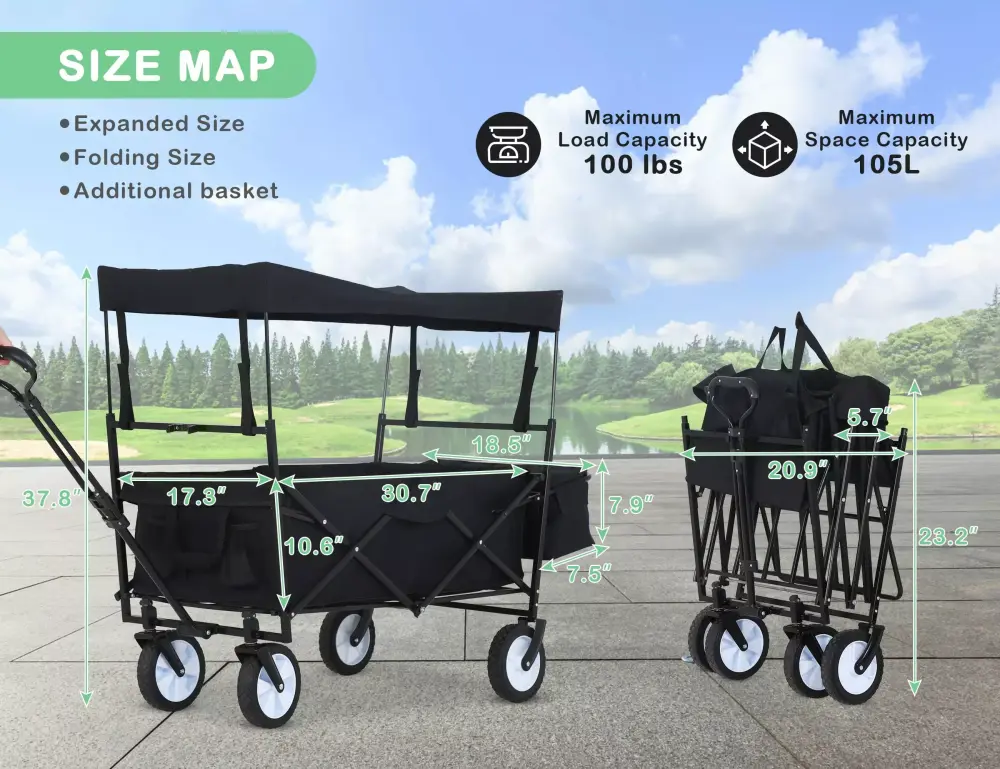 - Heavy Load & Extra Pocket : Utility wagon has 110L large-capacity internal storage. the max capacity is 170lbs. weight 22.61LBS. It can be widely used in outdoor activities. such as camping. fishing . beaches. parks. barbecues and etc. Portable wagon also has two storage bags beside handles. all emergency items. such as beverage and umbrellas . are within reach.