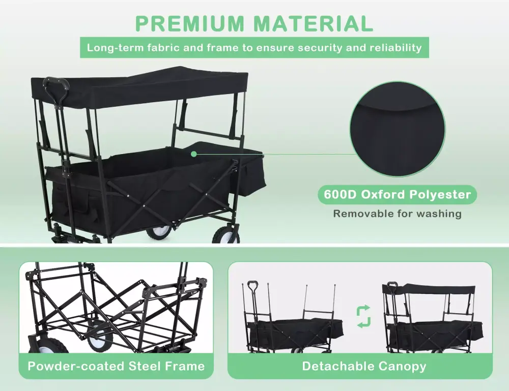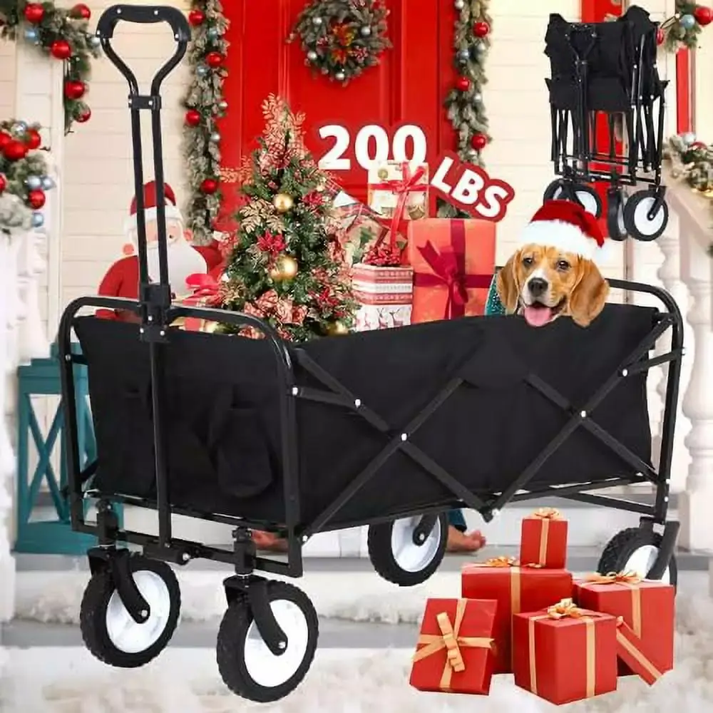 - 4Solid All-Terrain Wheel :This collapsible wagon utility cart equipped with four all-terrain wheels. including two front wheels that can rotate 360 degrees.Our folding collapsible wagon can roll on different ground. from cement to wood floor. from stone road to sand.Anti-slip wheels help prevent cart from slipping. Easy to move around smoothly.wagon