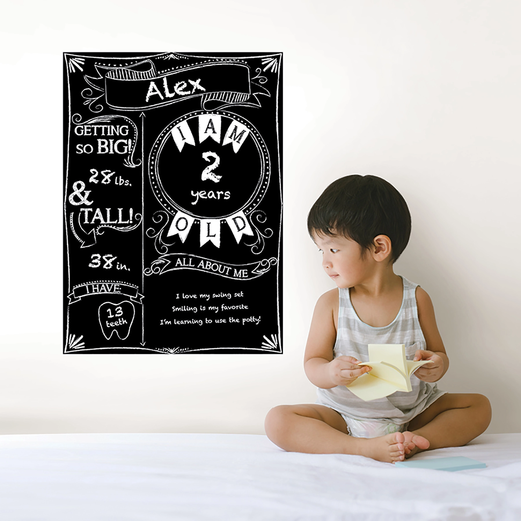 Track your baby’s milestones as they grow! Charming hand-drawn details decorate spaces to record age. height. teeth. and what they are currently loving. Use chalk to write on the decal surface. Monthly Milestone Chalkboard Decal contains 1 piece on 1 sheet that measure 17.5 x 24 inches.