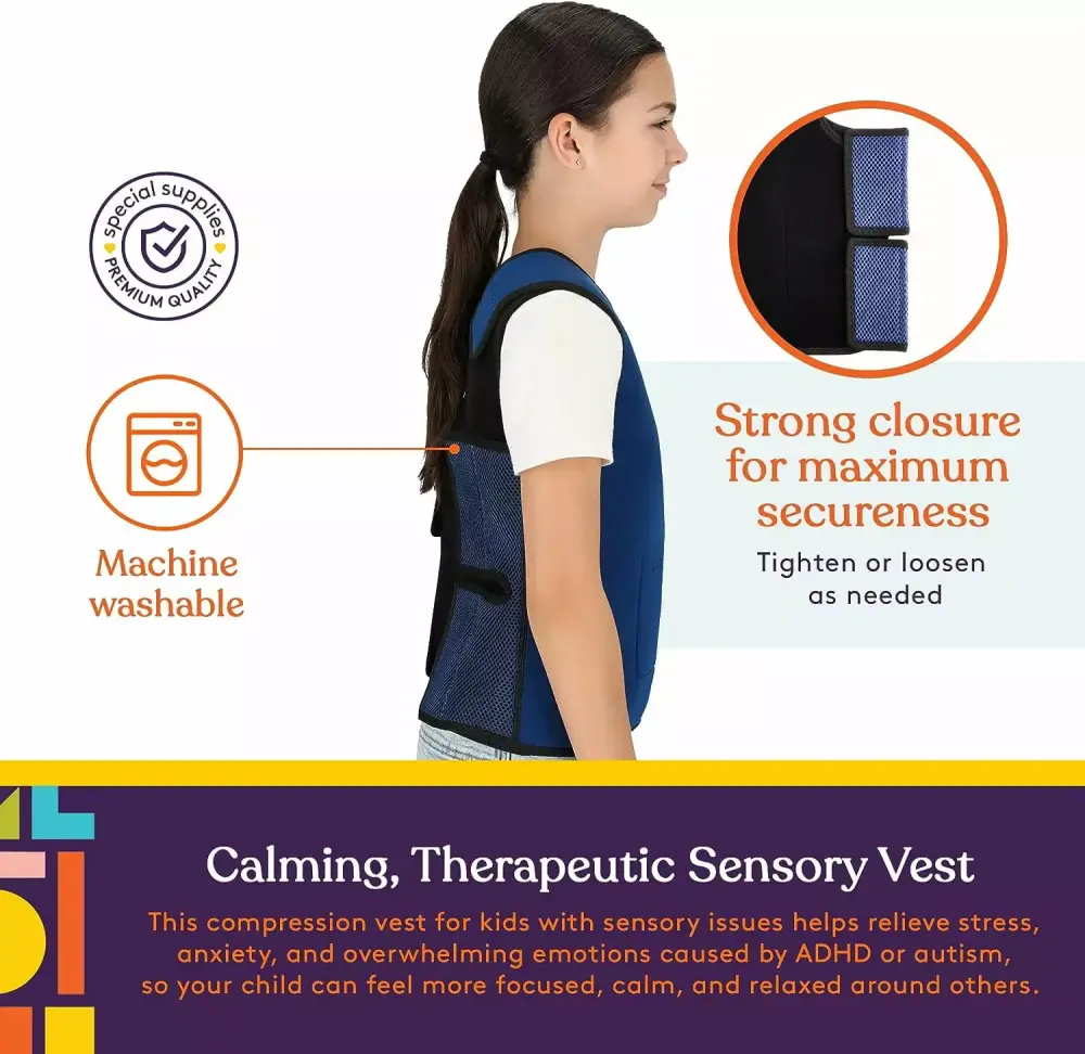 Keep your child more focused and relaxed with a sensory weighted compression vest designed to wrap them in a comforting hug. If your child struggles with physical sensory issues. especially when it comes to ADHD or autism. helping them stay calm and relaxed can be challenging if they simply feel that the world is too big. That’s why wrapping them in a Special Supplies Compression Vest can go a long way to easing fears. reducing stress. and keeping them focused and engaged at home or in the classroom. Comfy Compression and Even Weight Distribution The adjustable shoulder straps. midsection straps. and removable sandbags make the Special Supplies weighted compression vest more comfortable for kids with all different sensory needs. In fact. you can use the compression by itself and add more weight as needed based on their individual size or particular sensory requirements. And because it’s cool. comfortable. and breathable they can wear it every day to reduce stress. anxiety. or overwhelming emotions.