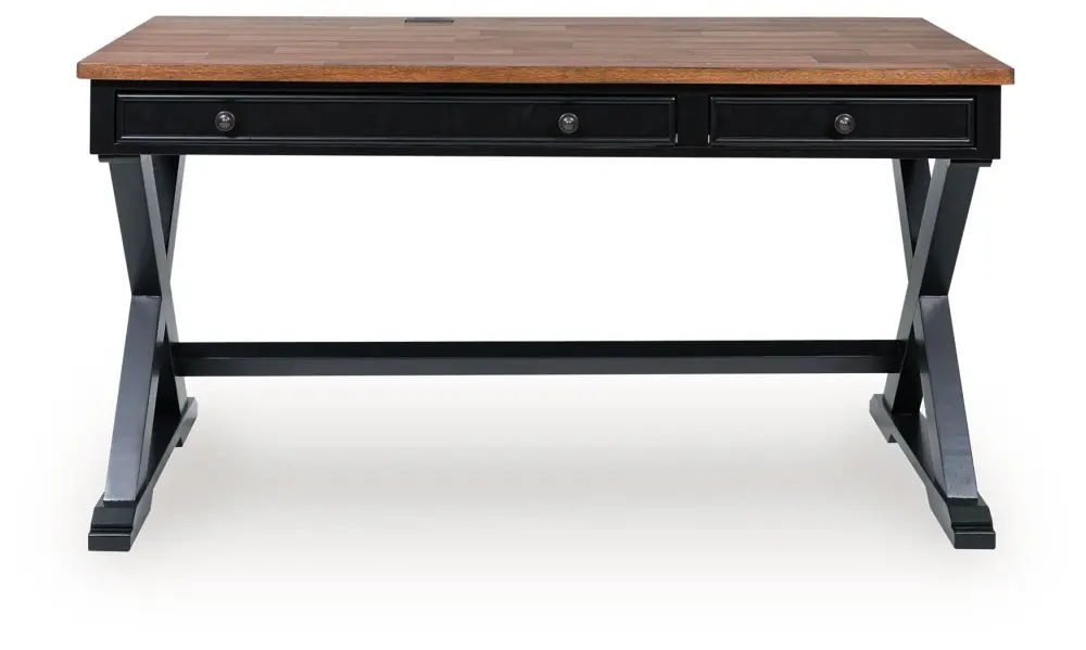 Raise the bar on modern farmhouse style with this home office desk. Its casual top-notch looks are accentuated with a two-tone finish, which pairs a warm satin black base with a contrasting butcher block veneer desktop. The drop-down keyboard and cord management raceway bring both form and function to your at-home workspace. Use this desk as a stand-alone work area, or combine it with the matching desk return (sold separately) to create a larger work surface.