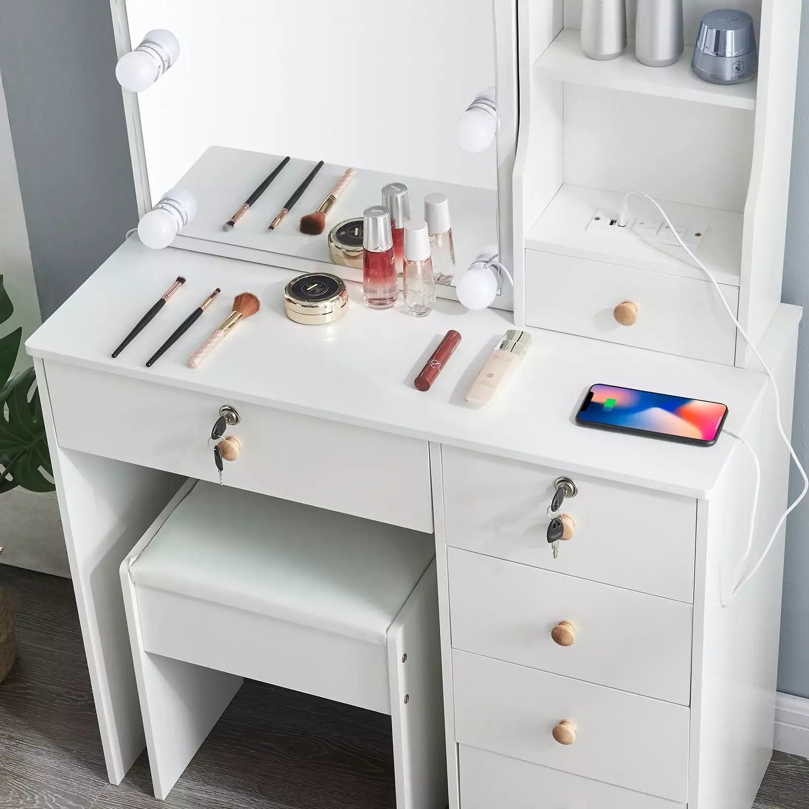 - Powerful Drawers CapacityWith 6 storage drawers of 2 different sizes. this lighted makeup table set offers ample space for organizing your makeup tools and skincare products. The large drawers are perfect for items like hair dryers. curlers. and combs. while the small ones are ideal for skincare products.