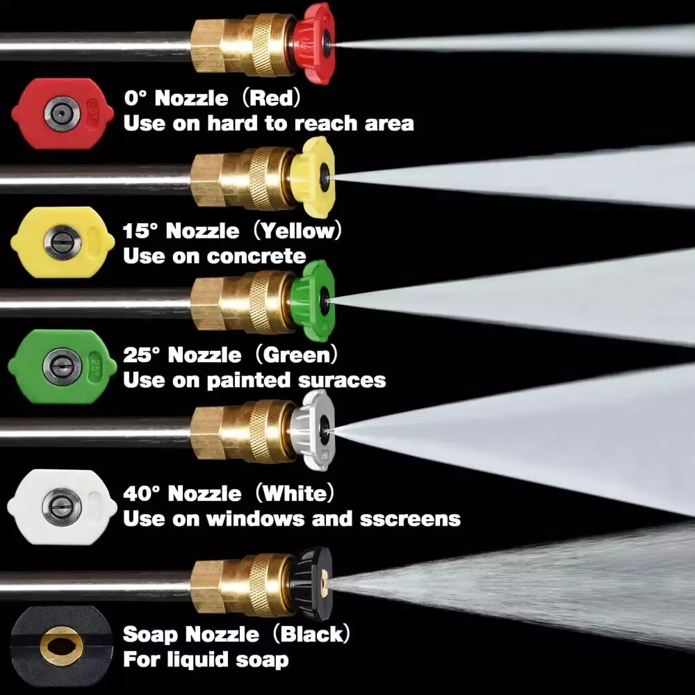 -Adjustable & Customizable – Comes with 5 interchangeable nozzles including 0 .15 .25 .40 and detergent nozzle. which are easy to fix on the spray wand for effectively washing different surface such as concrete. painted surface and windows. solving your toughest cleaning projects