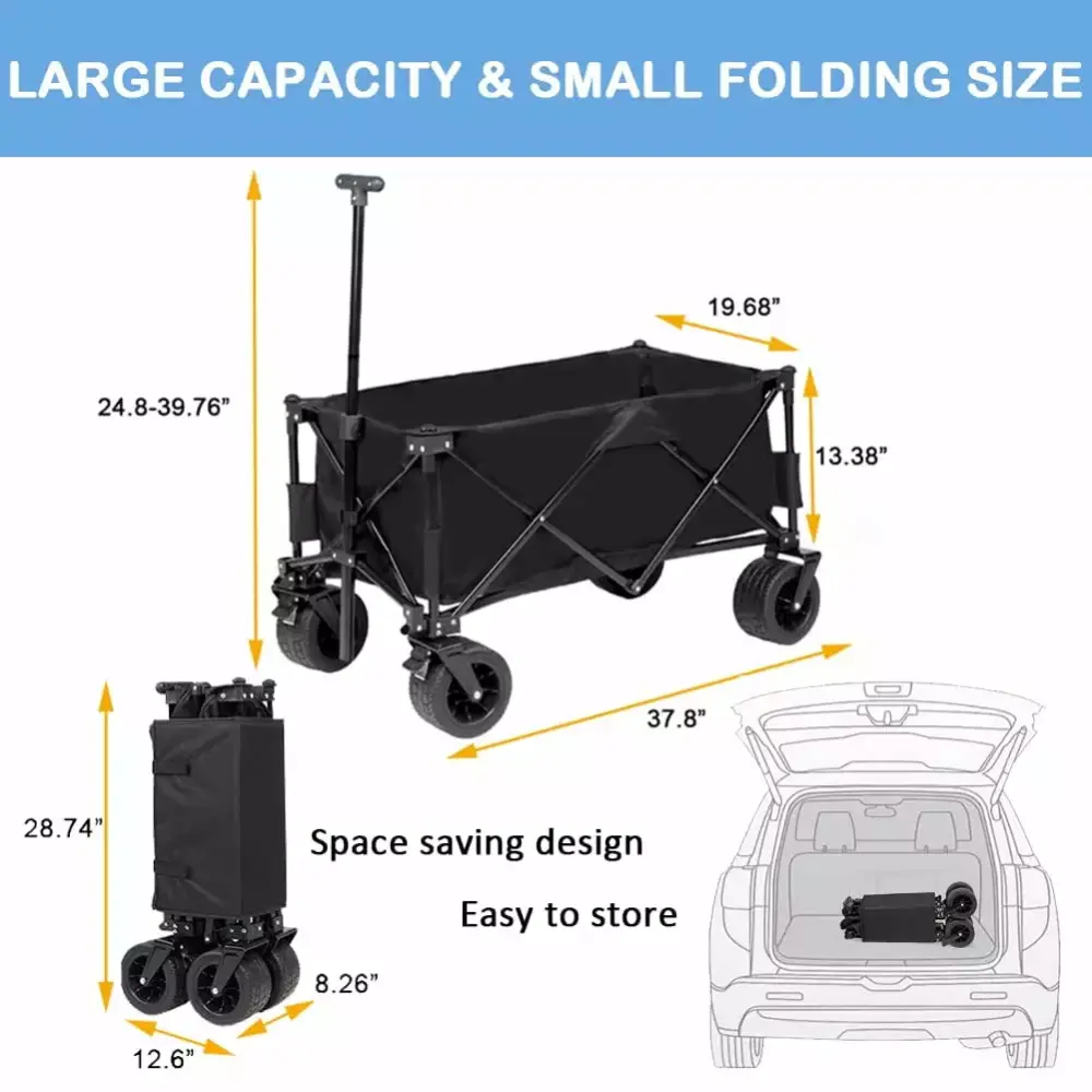 - SMALL SIZE FOR EASY STORAGE: Taking the outdoor use and space-saving storage into consideration. we have upgraded our beach cart and reduced its folding size to approx 8.3 x 12.6 x 28.7. allowing it to be easily stored in the trunk of your car. your closet or garage.