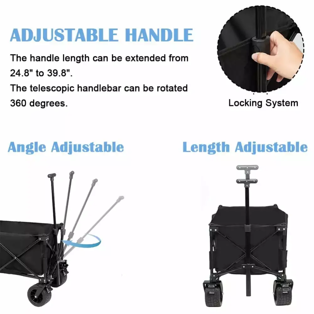 - ADJUSTABLE HANDLE: The handle length of this folding garden cart can be extended from 24.8 to 39.8. The handle locks in place with a joint so no need to worry about it drops or the cart out-of-control. The angle also can rotate smoothly as you need allows you to control the push wagon and navigate terrain with ease.