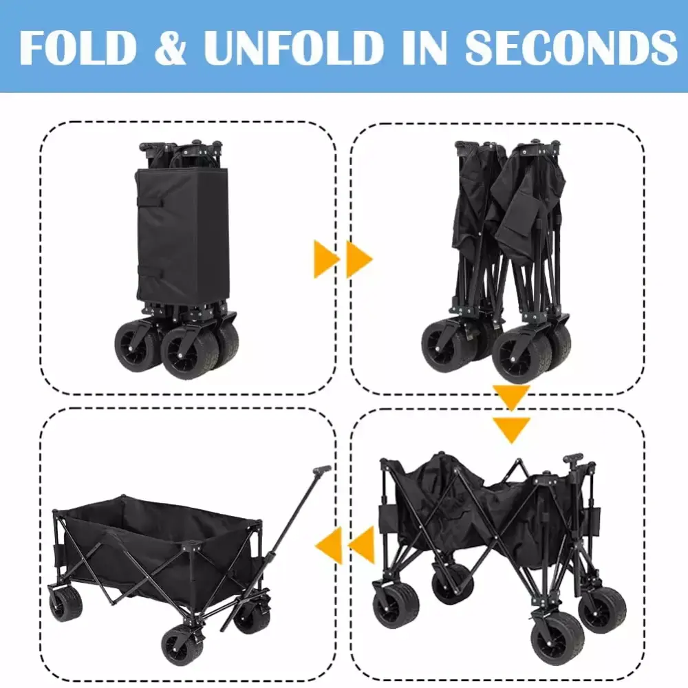- LARGE ALL TERRAIN WHEELS: Collapsible wagon comes with heavy-duty 6.7x 4 thick wide wheels. suits different road surfaces. Four 360 rolling wheels roll smoothly to keep it overcome sand. grass and bumps. Front wheels have a separate brake device to ensure smoothness and safety when parked.
