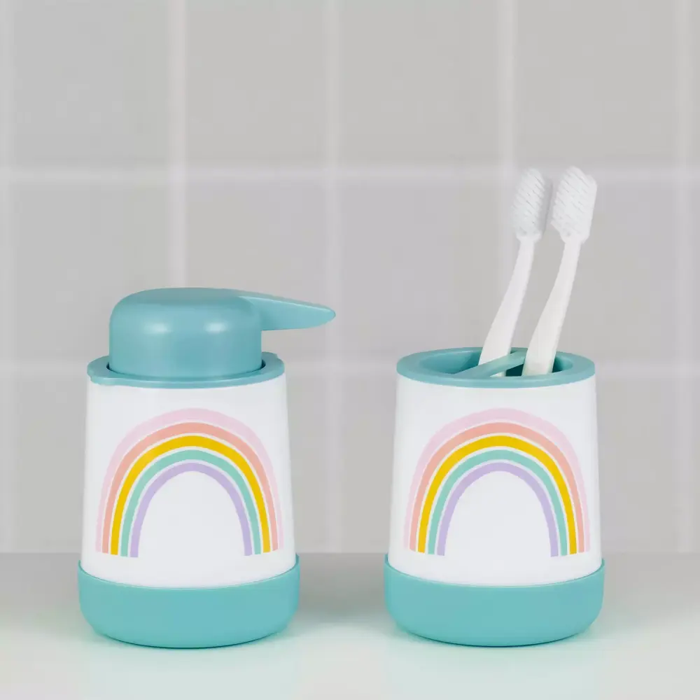 Introducing the Your Zone Rainbow Plastic Toothbrush Holder. a whimsical addition to brighten up your child’s bathroom routine. Crafted from durable plastic with a silicone bottom for stability. this toothbrush holder combines functionality with fun. Its removable top ensures easy cleaning and offers dual functionality fit for both standard and electric toothbrushes. Whether you choose to coordinate it with other pieces from the Your Zone Bath Collection or use it on its own. this toothbrush holder is sure to add a touch of fun to bath time. With its vibrant rainbow design. it’s bound to make your child’s bath time a delightful and exciting experience. all while keeping their toothbrushes organized and easily accessible.